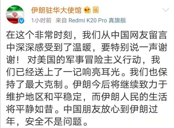 1月8日一早,伊朗驻华大使馆官微的这条更新,就在微博上“爆”了。