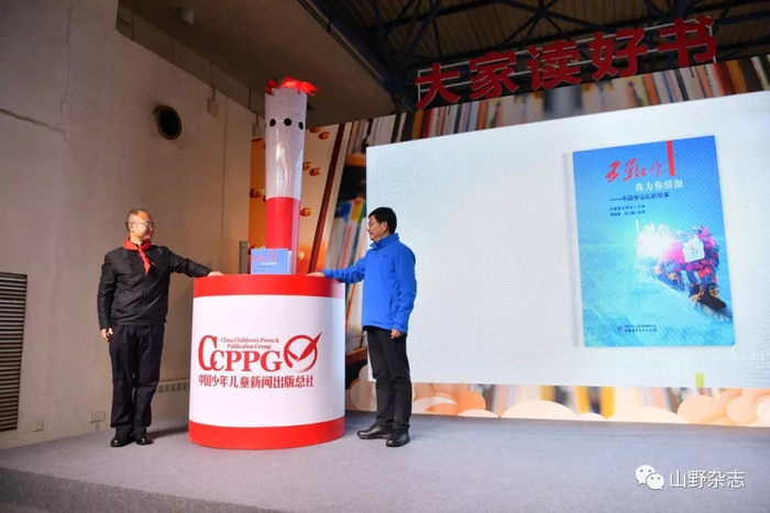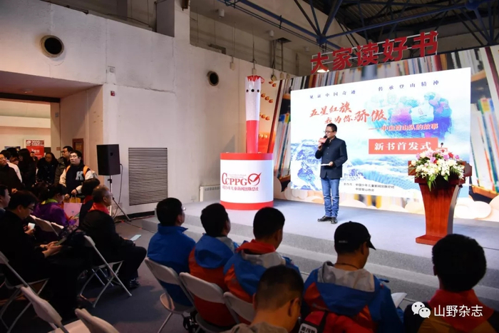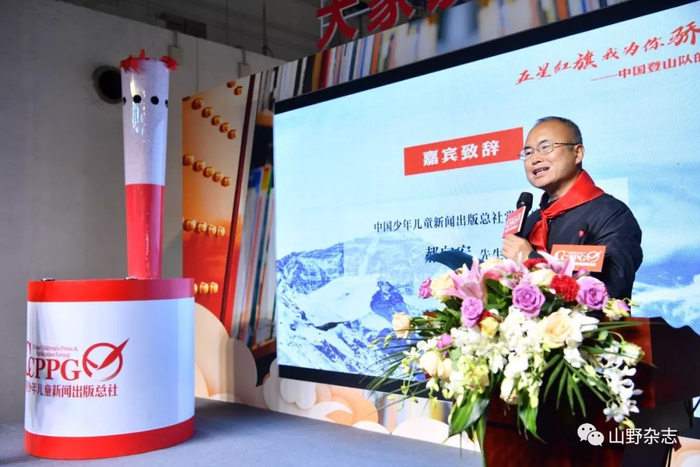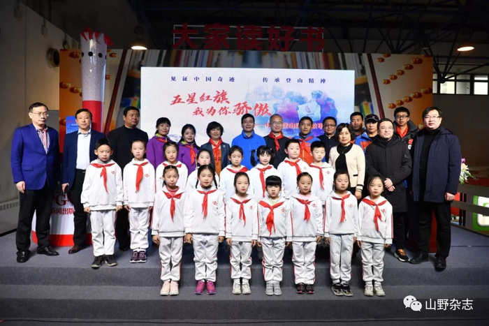在新书首发式上,中少总社副社长刘勇敏亲手将一面印有星星火炬图案的队旗,交到中国登山队副队长次落的手中,希望英勇的中国登山队员能够在下一次登顶珠峰时,将这面代表着中国少年儿童对登山精神传承与发扬的旗帜带上,让它与五星红旗共同飘扬在世界之巅。