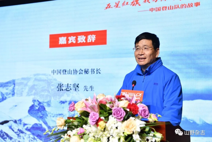 中国登山协会秘书长张志坚在致辞中先是提出了几个问题,“在世界的最高处有什么?”“在海拔8000米以上是什么感觉?”“在手可摸天的地方,世界是什么样的?”“人在世界之巅是感觉到做人的伟大还是渺小?”把现场观众带到了雪山之巅神游了一番,并引发大家的深入思考。