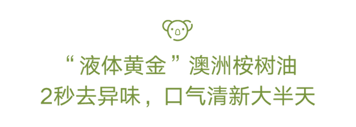 桉树提炼成油后,桉树脑含量大大提高,抑菌率至少增强10倍,特别适合用于去除细菌引起的口腔异味。