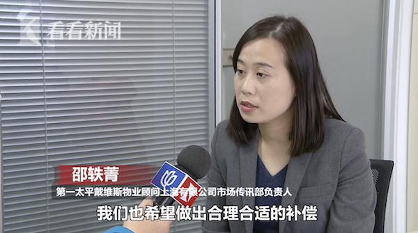 第一太平戴维斯物业顾问上海有限公司市场传讯部负责人邵轶菁表示:“我们非常关心她(受害人)目前的进展和近况,我们也希望做出合理合适的补偿,尽量减少这件事情对她的影响。”