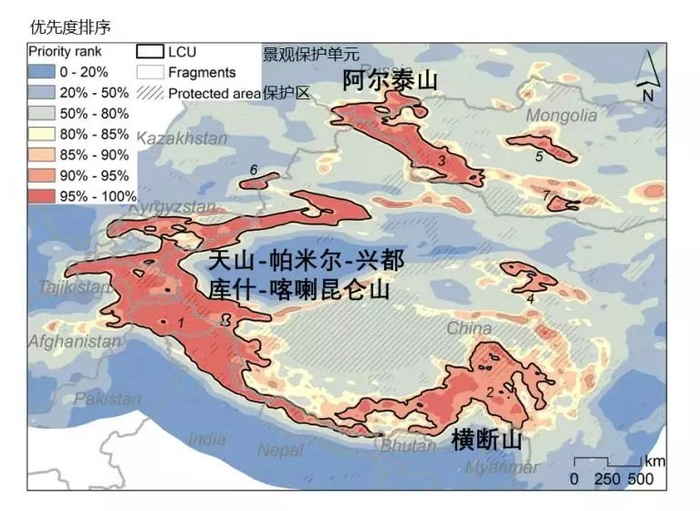 论文显示,研究人员在全球共收集到6252个雪豹出现点,通过构建全球雪豹栖息地模型、采取空间优先度分析,识别出七个栖息地优先度在前10%且面积大于10000平方公里的栖息地(研究将其定义为“全球雪豹景观保护单元”)。