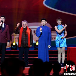 大陆相声演员赵炎(左二)、台湾相声演员刘增锴(右二)携女弟子姬天语联袂出演。 王东明 摄
