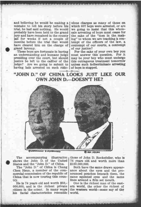 1915年6月10日出版的芝加哥《每日纪事报》把张弼士和洛克菲勒的照片放在一起进行比较