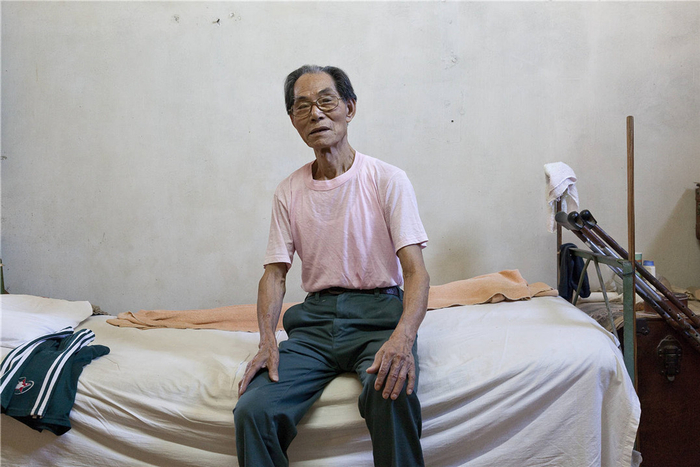遇见黄民达是2009年5月,他一个人住在三楼,要穿过楼下黄江夏堂餐馆才能上去,不过这样对他和餐厅都没添多余的麻烦。因为他断了一条腿,装配了义肢代步,这栋楼没有电梯,黄民达连楼都下不了,只能一直待在三楼。独居者的气息各有不同,刘博智在黄民达家印象最深的就是有两三碟粉,是爽身粉,用来磨合他身体和义肢、拐杖接触的部分。他以前是做洗衣房的,用惯了熨斗,总是将自己的一身衣服熨得平直整洁,即使他根本出不了门。