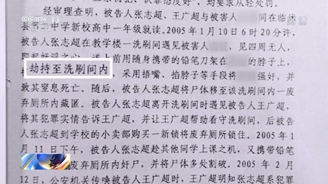 据判决书显示:2005年1月10日6时20分许,被告人张志超在教学楼一洗刷间遇见被害人高某,见四周无人,遂上前将高某劫持至洗刷间内,将高某强奸,并致其窒息死亡。随后,张志超将尸体移至洗刷间内一废弃厕所内藏匿。被告人张志超离开洗刷间时遇见被告人王广超,将其犯罪事实告诉王广超,并让王广超帮忙看守洗刷间,之后被告人张志超到学校的小卖部购买了一把新锁将废弃厕所锁住。