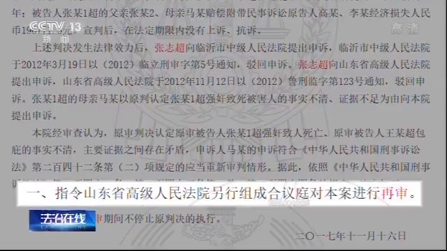 从2016年4月开始,最高民法院的工作人员与张志超的母亲和律师进行了多次沟通,在详细了解了更多有关案件的情况后,2017年11月,最高人民法院作出裁定,认为案件事实不清,主要证据之间存在矛盾,指令山东高院对张志超强奸致人死亡一案进行再审。
