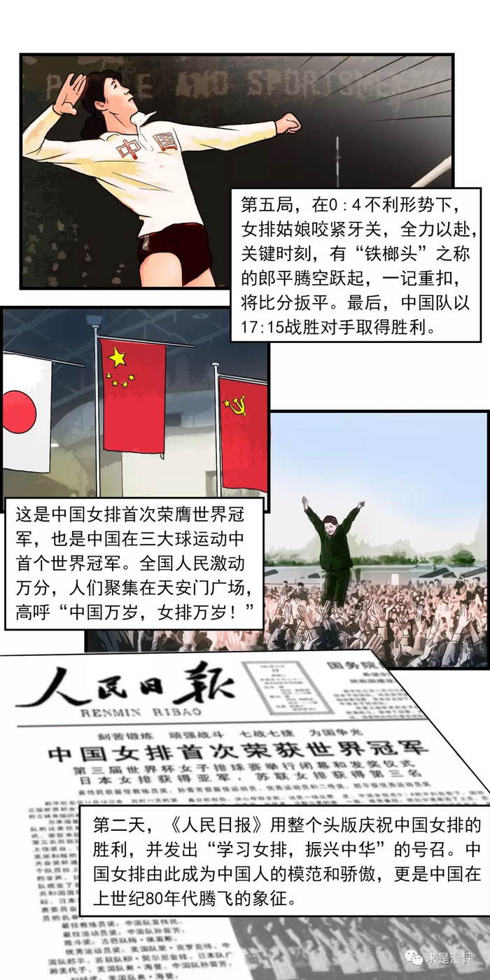 第二天,《人民日报》用整个头版庆祝中国女排的胜利,并发出“学习女排,振兴中华”的号召。中国女排由此成为中国人的模范和骄傲,更是中国在上世纪80年代腾飞的象征。