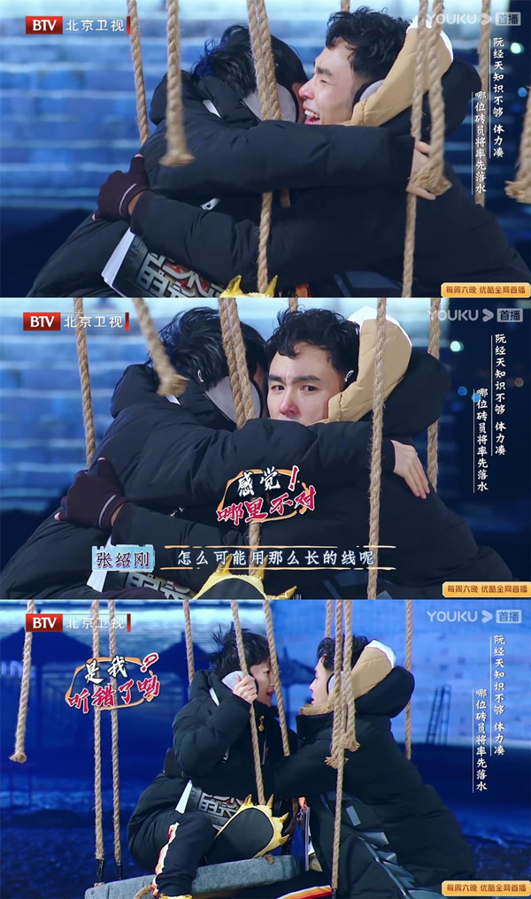 阮经天和周深以为答对了欢喜相拥庆祝,结果发现空欢喜一场。注意表情和肢体语言