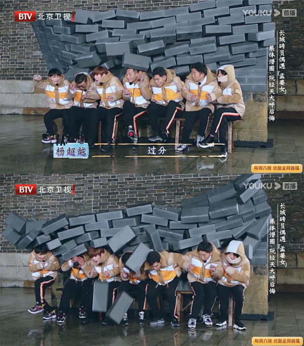 比如第一期有一个水上飞龙挑战项目,嘉宾可以自由选择是否挑战,阮经天、杨迪、黄明昊接受挑战,其余几个人找借口搪塞。到饭桌上,嘉宾们才发现接受挑战的人筷子是灵活的,其余人的筷子被束缚住,很难夹到东西。这就是剧本上的一点小心机,自然地形成反差和反转。至于孟姜女哭倒长城这一幕,堪称神来之笔。