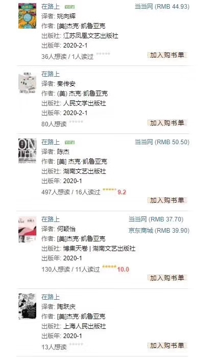 1月还不过半,澎湃新闻记者发现凯鲁亚克的代表作《在路上》已在豆瓣上呈现“五花八门”的面貌,且它们都将于今年1、2月出版。