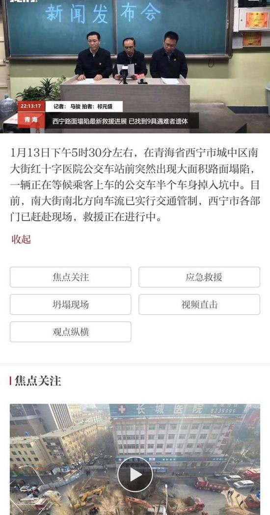 青海西宁一辆公交车坠入地陷大坑,遇难人数升至9人。1月13日17时30分左右,在青海省西宁市城中区南大街红十字医院一公交车站前突然出现大面积路面塌陷,一辆等候乘客上车的公交车掉入坑中。