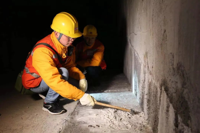 铁路职工对通道内排水系统的钙化物沉积情况进行检查。