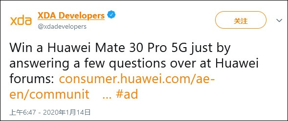 为了吸引开发者参与,1月14日,华为在移动软件开发社区XDA-Developers社交账号上投放了一条有奖问答链接。