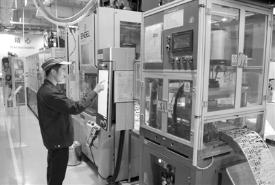 台邦电机工业集团有限公司的金属加工车间内,数控磨床技术人员在自检测量工件。 洪恒飞摄