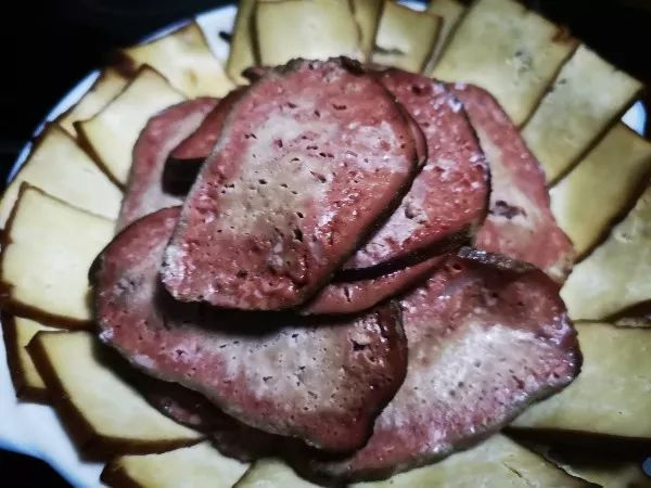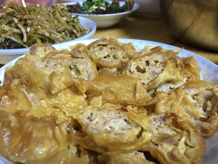 血豆腐算是年味里最有特色的菜肴之一,将新鲜嫩豆腐捣碎,加猪血、调料拌匀用菜叶包制,再用松枝熏烤,食用时将其切片,上笼蒸熟即可食用,清淡爽口刚刚好。