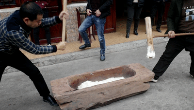 贵州很多地方都有“二十八,打糍粑”的说法,年近三十的时候,外面冰天雪地,屋里糍粑打得热火朝天!在贵州很多地方,尤其是少数民族,每逢春节腊月二十八,几乎家家都要打糯米糍粑!