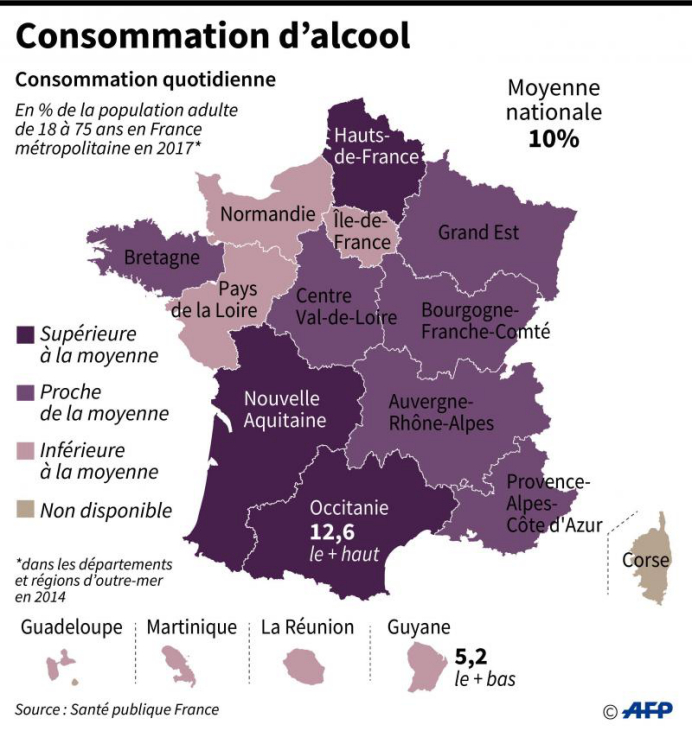 该机构指,法国成年人每日饮酒比例达10%,巴黎大区、诺曼底、卢瓦尔地区以及海外领地居民低于平均值,奥克西塔尼大区(12.6%)、新阿基坦大区(12.3%)和上法兰西大区(11.5%)居前三位。