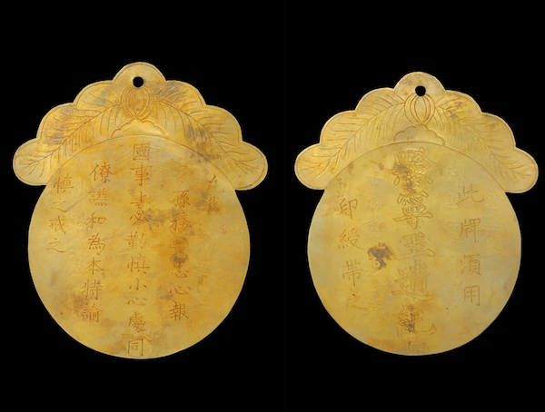1974年南京江宁县殷巷将军山沐睿墓出土。金质,圆形。上端饰两片蕉叶,穿一孔。正面中间刻“黔宁王遗记”5字,右侧刻“此牌须用”4字,左侧刻“印绶带之”4字。反面刻