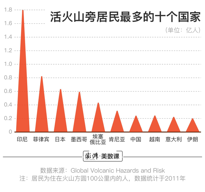 不过,全球的火山并不是均匀分布的,2/3的火山集中在环太平洋边缘的“火链”上,这里有的地方又人口众多。生活在活火山旁人数最多的三个国家都在西太平洋——印度尼西亚、菲律宾和日本,三国合计有超过3亿的居民居住在活火山旁。