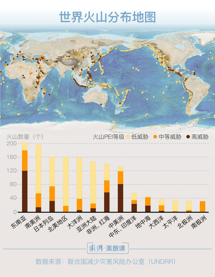 东南亚地区的高危火山(PEI等级为5到7级)数量显著多于其他地区。虽然南美洲的火山数量和东南亚地区相近,但高危的火山数量就少很多。