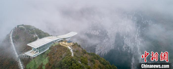 悬挑玻璃廊道观景平台“云海天舟”伫立于海拔约1450米大石围天坑西峰山脊上。 永恒传媒供图 摄