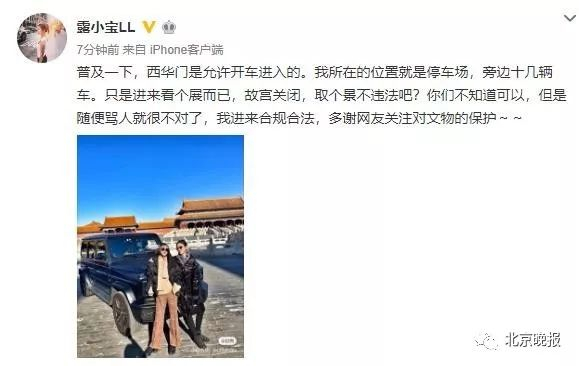 此事发生后,下午6时许,@露小宝LL 疑发微博澄清称,故宫西华门允许开车进入,自己所在的位置就是停车场,并称自己的做法“合规合法”。