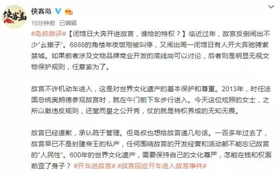 值得注意的是,故宫道歉后,人民日报海外版旗下账号“侠客岛”在微博评论称: