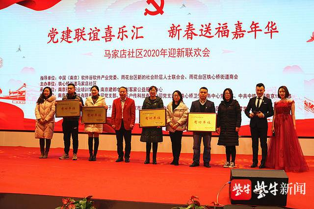 扬子晚报网 1月18日讯 (通讯员 汪子轲 记者 郑幼明)居民表演歌舞朗诵T台秀、社区为共建单位授牌、现场有写春联送“福”字抽奖大联欢……17日上午,主题为“党建联谊喜乐汇 新春送福嘉年华”的马家店社区2020年迎新联欢会,在中国(南京)软件谷会议中心二楼大厅举办。