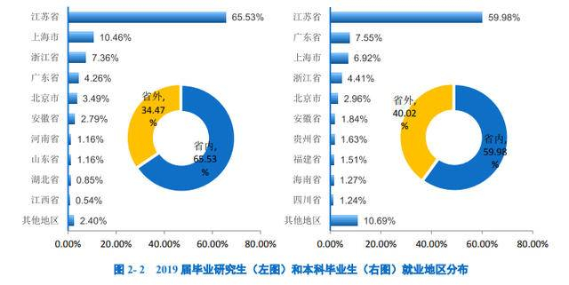 南邮毕业生都去了哪儿?从就业区域分布看,江苏省为学校 2019 届毕业生就业主阵地,服务地方经济发展;其中毕业研究生和本科毕业生省内就业流向城市以南京市、苏州市为主。