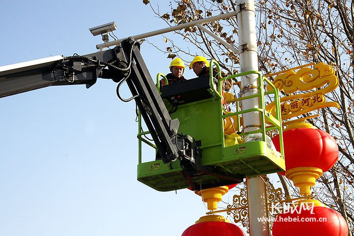 长城网1月19日讯(记者 王亚)19日上午9点半,在石家庄市裕华路与维明大街交口西行50米,记者看到照明工人正站在升降机上为临街灯杆逐一加装灯饰。放眼望去,已经安装完成的灯饰随灯杆走势,向裕华路纵向延伸开去,整条街道呈现出一派喜气祥和的节日景象。