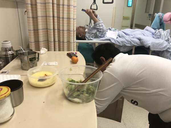 医生说李华贫血,康复或手术期间也要补充营养,这也难不倒她。靠着医院微波炉,她可以做出津甜的桂圆红枣糖水、绿豆沙、排骨花生汤,还能做白灼生菜、拍黄瓜等小菜。有人来看望,她总喜欢把病房称作家,问“留下来我家吃饭啊?”