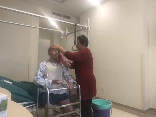 他像一个重新开始的孩子般,每天下地行走总得叫医生站旁边看着,就算科室忙碌也要等到医生才肯迈开步子。医生帮他扶正背部,他觉得陌生,惊慌失措地“啊啊”大叫。有次不知怎得晕了过去,小便失禁,嘴一撇跟护士说“不是我不听话,是尿不听使唤了”。