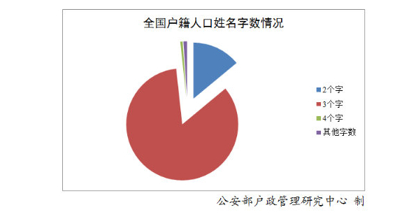 目前,我国除部分少数民族外,户籍人口姓名长度多为2至4个字。二字姓名为单姓单名、三字姓名为单姓双名或复姓单名、四字姓名为复姓双名,超过4个字的姓名比较少见。全国户籍人口中,三字姓名占比84.3%,二字姓名占比14.0%,四字姓名占比0.7%,其他字数姓名占比1.0%。