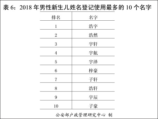 《报告》显示,2019年出生并已经进行户籍登记的男性新生儿中,使用频率最高的10个名字依次为:“浩宇”“浩然”“宇轩”“宇航”“铭泽”“子墨”“梓豪”“子睿”“子轩”“梓睿”。而2018年也是“浩宇当头”,频率最高的为“浩宇”“浩然”“宇轩”“宇航”等。