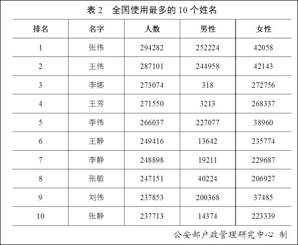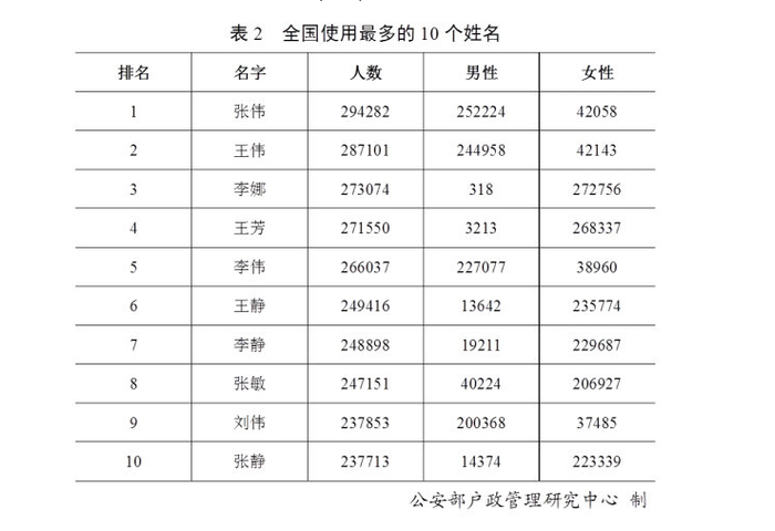 全国户籍人口中,使用频率最高的10个姓名依次为:“张伟”“王伟”“李娜”“王芳”“李伟”“王静”“李静”“张敏”“刘伟”“张静”。这些姓名男女皆有使用。(表2)