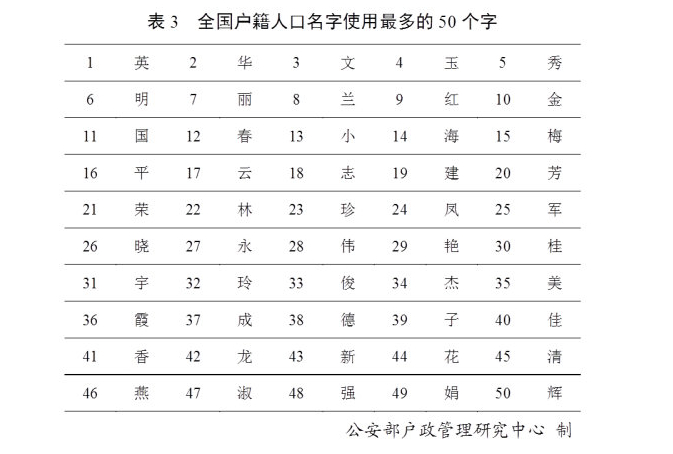 全国户籍人口中,名字使用频率最高的50个字依次为“英”“华”“文”“玉”“秀”“明”“丽”“兰”“红”“金”等。(表3)