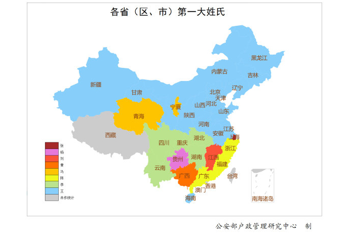 全国31个省(区、市)的姓氏人口分布不尽相同。“王”姓是全国第一大姓氏,同时也是北京、天津、河北、山西、内蒙古、辽宁、吉林、黑龙江、江苏、安徽、山东、河南、海南、陕西、甘肃、新疆16个省(区、市)第一大姓。“李”姓为湖北、湖南、重庆、四川、云南第一大姓。“张”姓为上海第一大姓。“刘”姓为江西第一大姓。“陈”姓为浙江、福建、广东第一大姓。“杨”姓为贵州第一大姓。“黄”姓为广西第一大姓。“马”姓为青海、宁夏第一大姓。