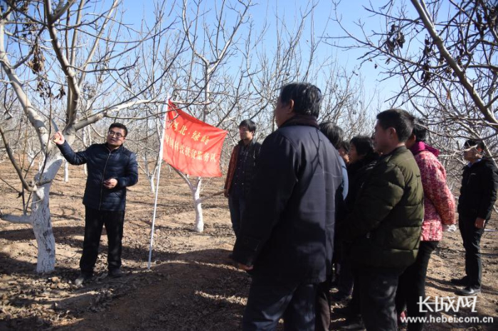 李保国的农民学生,来自内丘岗底村的苹果管理专家梁国军则在一旁给村里的老百姓示范,如何能使枝条显得更精神些,老百姓边看梁国军修剪边听。