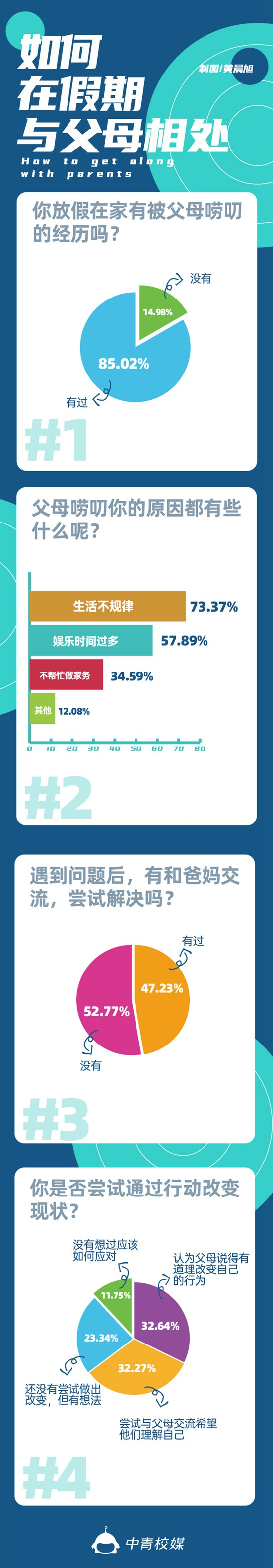 一些大学生在网上直呼,“放假回家3天就被爸妈‘嫌弃’了”。中青校媒面向全国各地高校的1622名大学生发起关于“大学生假期和父母相处情况”的调查。调查结果显示,85.02%的大学生都曾有过假期被父母唠叨的经历,47.23%的大学生尝试和父母沟通,希望增进相互理解。