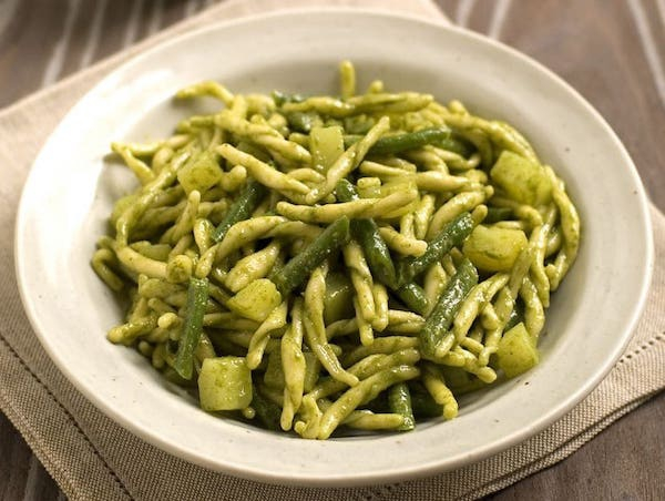 这道意面就是我们最熟悉的“青酱意面”,不过热那亚人不会用Spaghetti这类细面来煮,他们认为用特飞面(Trofie)搭配青酱才最正宗,口感也最好,且还会在煮面的时候,放入土豆和长豆角一起煮,来增加风味和营养。