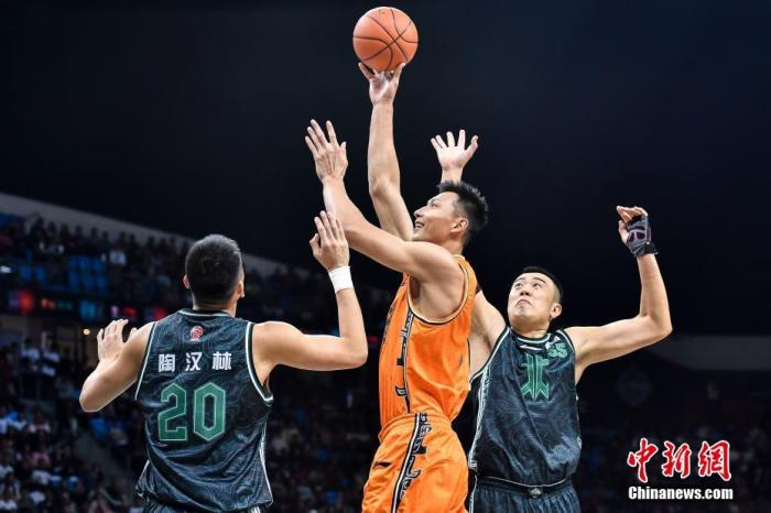 资料图:易建联(蓝)与林书豪(白)在比赛中。 中新社记者 崔楠 摄