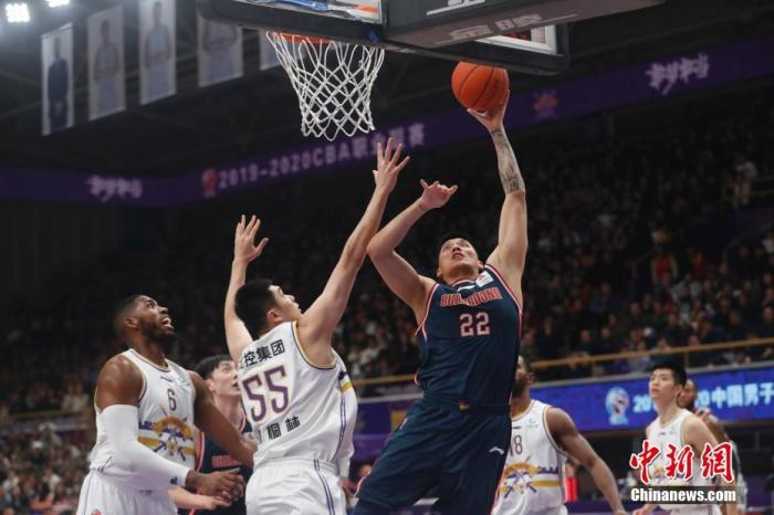 广东东莞银行球员曾繁日(右)在比赛中进攻。当日,在2019-2020赛季中国男子篮球职业联赛(CBA)常规赛第17轮比赛中,北京控股队主场126比111胜广东东莞银行队。中新社记者 韩海丹 摄