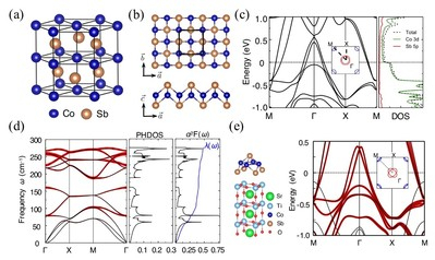 图例:(a) CoSb体态的原子结构;(b-d) CoSb单层的原子结构、电子结构及其电声耦合;(e) CoSb/STO的原子结构与电子结构。