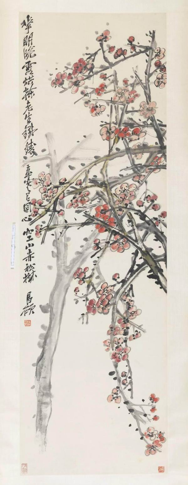 吴昌硕 红梅 纸本水墨设色 中国画 年代不详 137cm×43.5cm 2015年老舍、胡絜青家属舒济、舒乙、舒雨、舒立捐赠