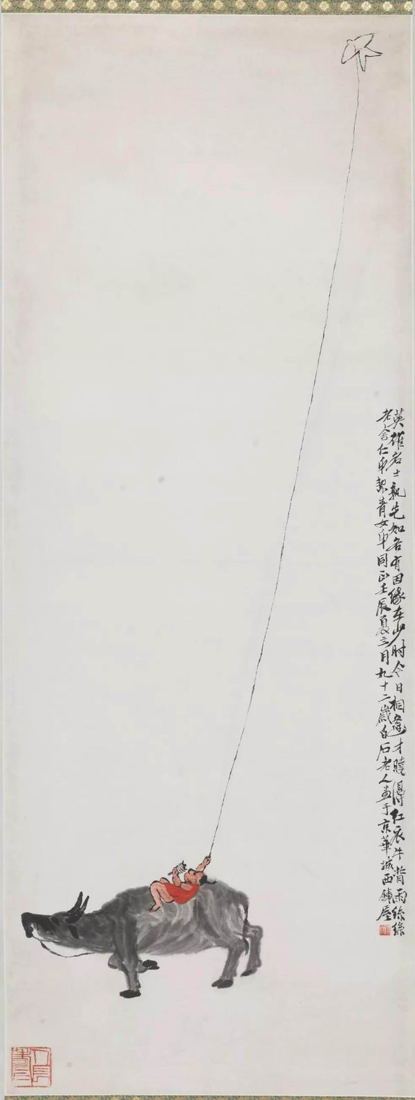 齐白石 红衣牛背雨丝丝 纸本水墨设色 中国画 1952年 151.5×56.5cm 2015年老舍、胡絜青家属舒济、舒乙、舒雨、舒立捐赠