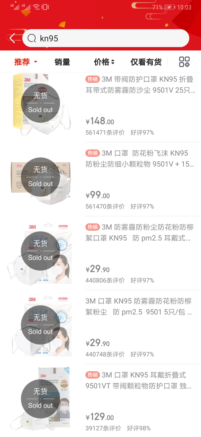 受上述疫情影响,部分电商平台可孚医用口罩及3M口罩销量紧俏,特别是此前主打防霾、防粉尘、防病毒的3M KN95系列口罩,在多个电商平台的3M自营店中,处在“缺货”、“无货”状态。