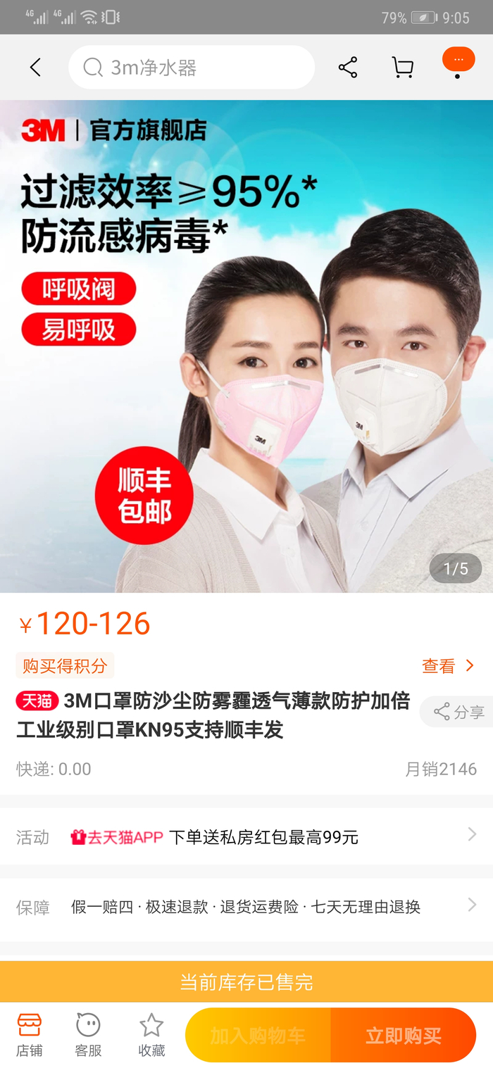 天猫3M官方旗舰店,KN95口罩已售完。