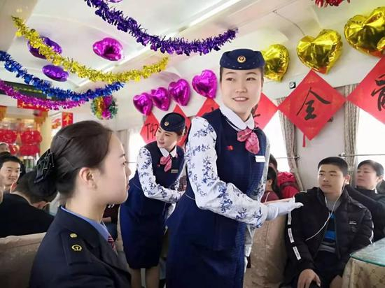 说话间,音乐响起,穿着“仙女”装的列车员闪亮登场为大家送来春联和“福”字,自编自演的节目逗得大家哈哈大笑,包饺子比赛更是将氛围推向高潮。“今年的回家路太温暖!小姑娘们太走心了!”王女士掩盖不住内心的激动,为大家献歌一首助兴。