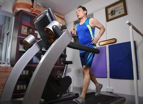 每次锻炼,钟南山都是穿上运动背心先在跑步机上快走和慢跑,然后才进行其他的训练流程。
